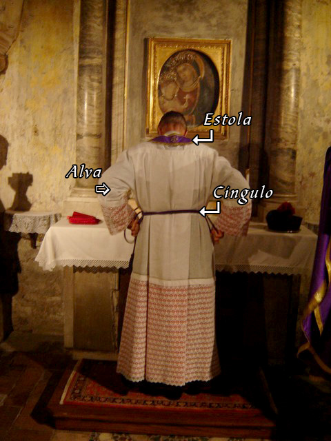 A alva e a estola: a alva é a veste branca que desce até os pés (veste talar). “E a veste comum aos ministros de qualquer grau” (Intrução Geral do Missal Romano). A estola é uma faixa de tecido da mesma cor da casula que o sacerdote trás em torno do pescoço deixando pender as pontas diante do peito. O Diácono usa a estola a tiracolo sobre o ombro esquerdo. A Estola simboliza a autoridade espiritual do sacerdote.